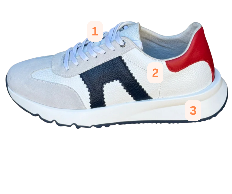 Le mélange de cuir grainé blanc et de bandes contrastées noires et rouges crée un look dynamique et raffiné. Chaque détail reflète un style audacieux et contemporain.